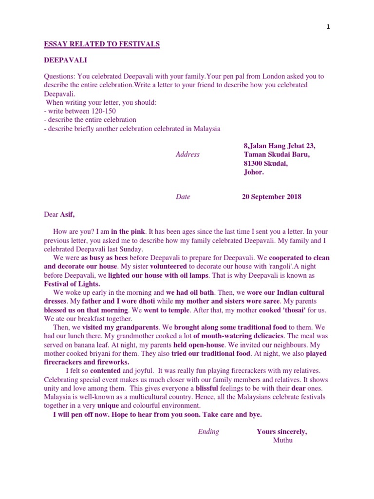 Dec 27 2015 PT3 Essay - Informal Letter Deepavali Celebration Karangan PT3 - Punca-punca Kemalangan Jalan Raya. Me and family as a Muslim Hari Raya Puasa is a special day to celebrate after they have gone through fasting for a month from foods and drinks from Subuh until MaghribFollow these steps. Top 5 Best Electric Guitar for Church Music Review.
